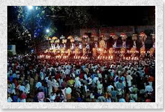 Pooram commences in the Malayalam month of Meenam. In the Karkidakam Raasi of Makeeram Star (astrological zodiac of kerala), after the resonance of ritual fireworks, Pooram procession begins. In the following days, ‘ Erakkivachu pooja’ is done at Tantri homes and Arattu (special poojas and dipping idle in Temple pool by chanting various manthras) at prominent temples of the region. Arattupuzha is the splendid conjugation of 33 crore Devas (Gods) at the splendid Deva Mela (assembly of Gods). The head of this festivities is Thriprayar Thevar (Triprayar temple is one of the most ancient temples in kerala). In the ancient ritual of strengthening of the Guru and disciple bond, the Devis (Goddesses) and shasthakals (Maharishi) of Northern Kerala converge at Arattupuzha (Temple of Maharishi Vasishta, he was the ‘Guru’ of Sree Rama). On both sides of the procession of the Thevar, Cherpu Bhagavathi and Uragathu Amma (Two incarnation of Godess Mahalakshmi) welcome him accompanied by 71 ‘tuskers’ (Elephants wearing festival ornaments). Shaasthavu (Maharishi Vasishta) welcomes the guest with the accompaniment of 15 tuskers.